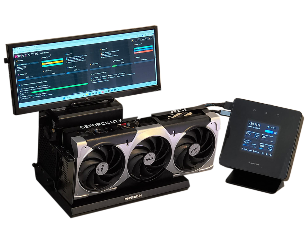 • Processore Intel® Core Ultra 9 185H • 32GB DDR5 RAM • 1TB SSD • eGPU NVIDIA GeForce RTX 5070 Ti 16GB • Dock per scheda grafica esterna • Alimentatore GPU da 1.000W • LLM Gemma 3 con 12 miliardi di parametri